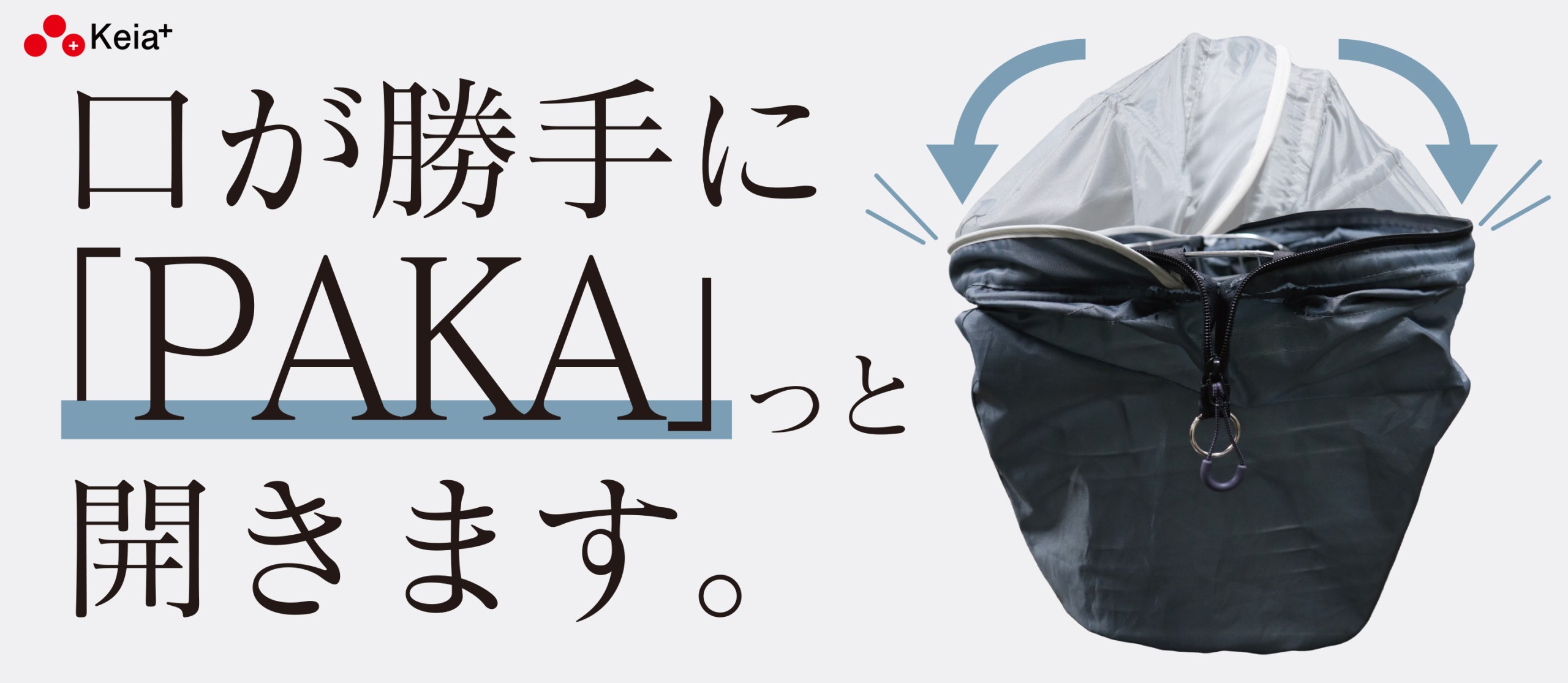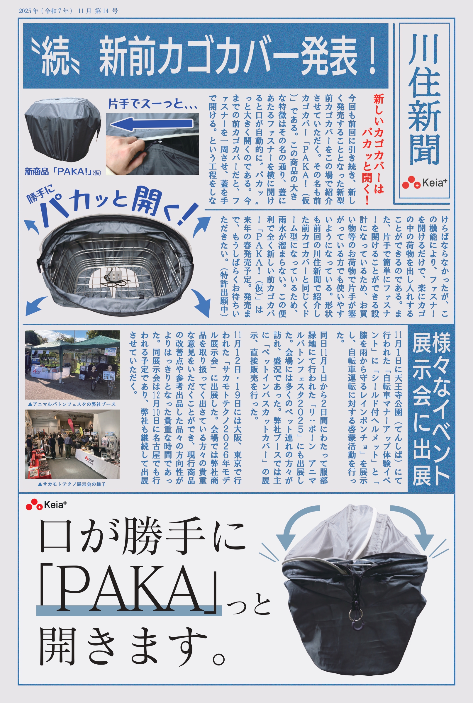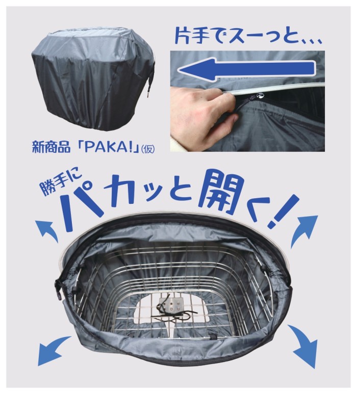 今回も前回に引き続き、新しく発売することとなった新型前カゴカバーをこの場で紹介させていただく。その名も前カゴカバー「PAKA!(仮)」である。この商品の大きな特徴はその名の通り、蓋にあたるファスナーを横に開けると口が自動的に〝パカッ〟っと大きく開くのである。今までの前カゴカバーだと、ファスナーを一周させ、蓋を手で開ける。という工程をしなけらばならなかったが、この機能により、ファスナーを開けるだけで、楽にカゴの中の荷物を出し入れすることができるのである。また、片手で簡単にファスナーを開けることができる設計になっているため、お買い物等のお荷物で片手が塞がっている方でも使いやすいようになっている。形状も前回の川住新聞で紹介した前カゴカバーと同じくドーム型になっているため、雨水が溜まらない。この便利で全く新しい前カゴカバー「PAKA!(仮)」は来年の春発売予定。発売まで、もうしばらくお待ちいただきたい。(特許出願中)