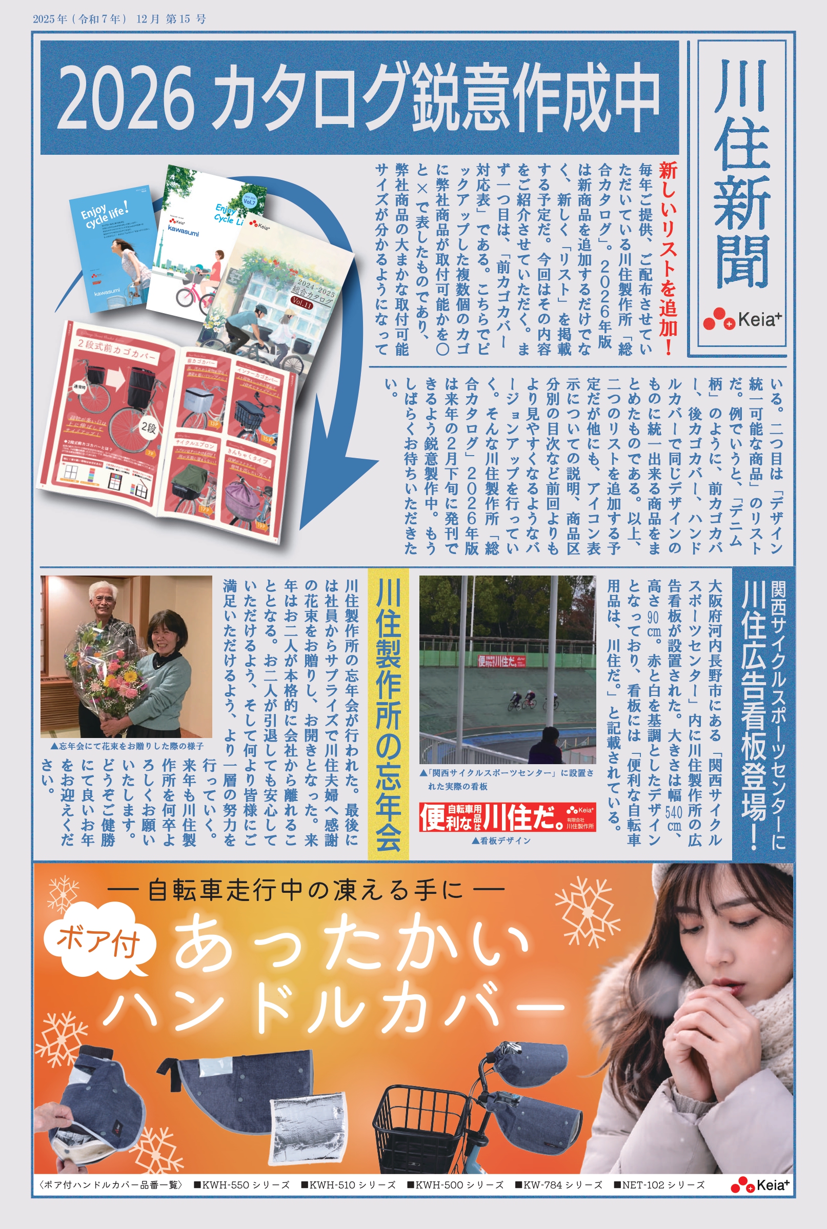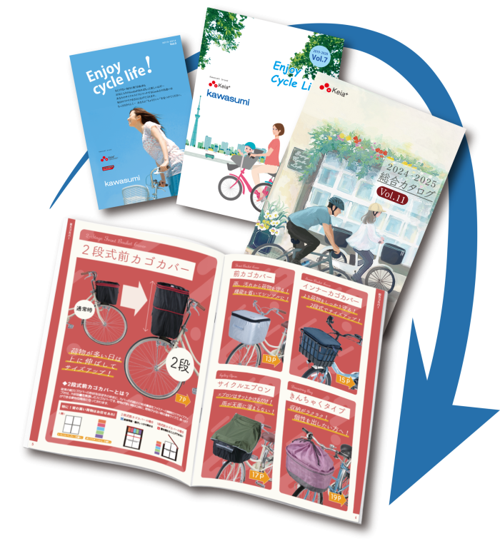 毎年ご提供、ご配布させていただいている川住製作所「総合カタログ」。2026年版は新商品を追加するだけでなく、新しく「リスト」を掲載する予定だ。今回はその内容をご紹介させていただく。まず一つ目は、「前カゴカバー対応表」である。こちらでピックアップした複数個のカゴに弊社商品が取付可能かを○と×で表したものであり、弊社商品の大まかな取付可能サイズが分かるようになっている。二つ目は「デザイン統一可能な商品」のリストだ。例でいうと、「デニム柄」のように、前カゴカバー、後カゴカバー、ハンドルカバーで同じデザインのものに統一出来る商品をまとめたものである。以上、二つのリストを追加する予定だが他にも、アイコン表示についての説明、商品区分別の目次など前回よりもより見やすくなるようなバージョンアップを行っていく。そんな川住製作所「総合カタログ」2026年版は来年の2月下旬に発刊できるよう鋭意製作中。もうしばらくお待ちいただきたい。